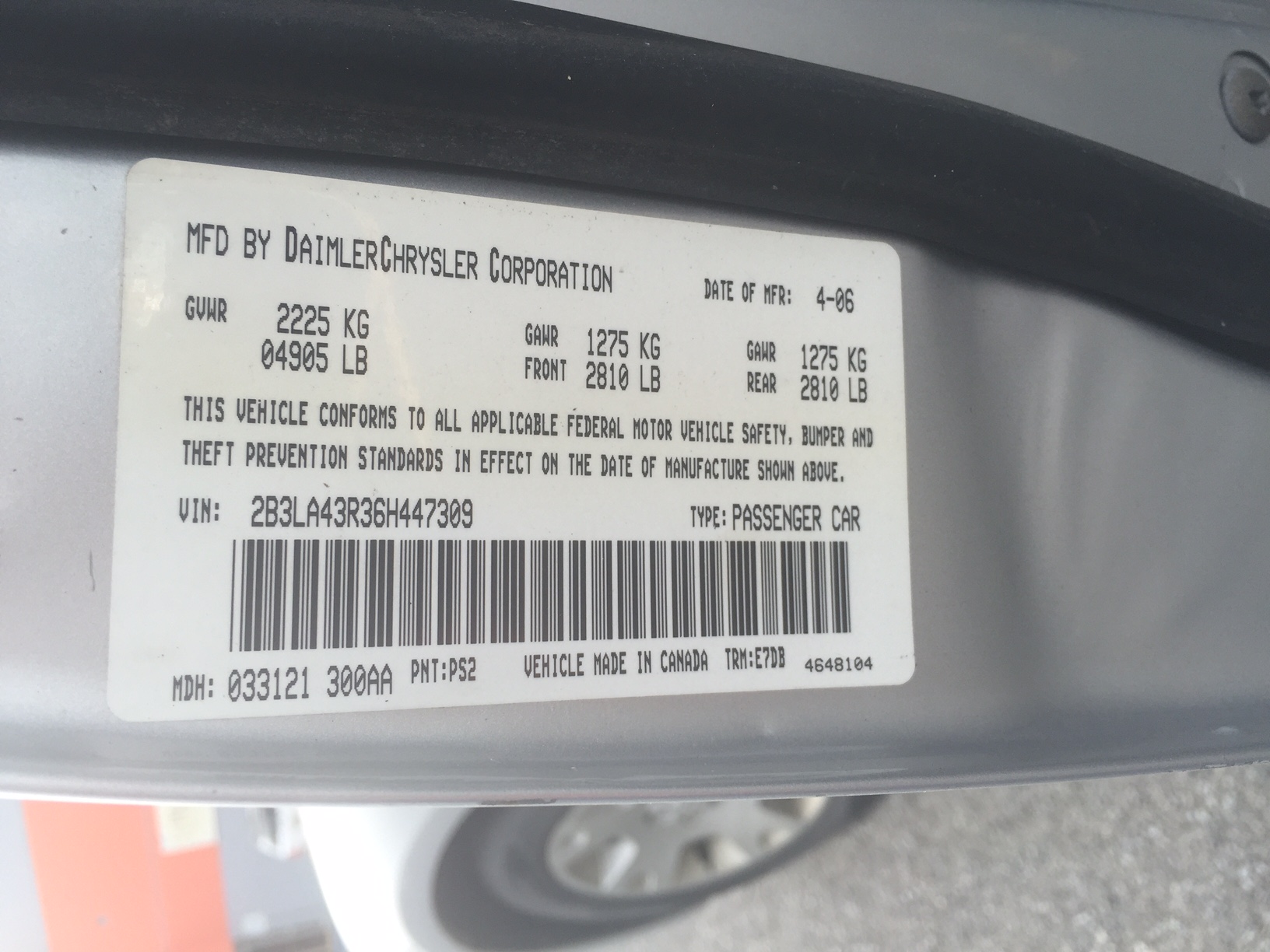 VIN: 2B3LA43R36H447309